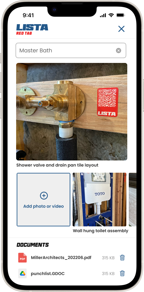 Add anything to a Lista tag: plans, schematics, drawings, files, photos and videos. All posted in the field, right where the work happens.